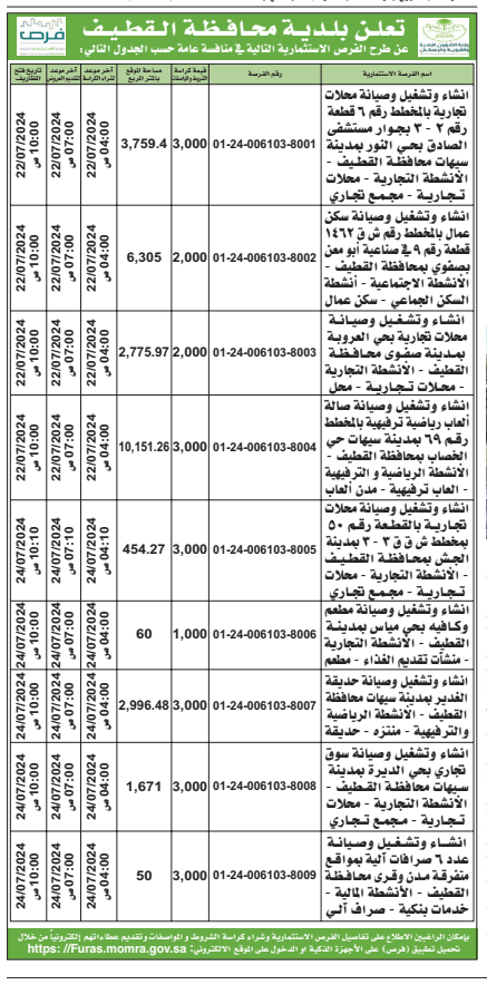 منافسة عامة- إنشاء وتشغيل وصيانة محلات تجارية- بلدية محافظة القطيف