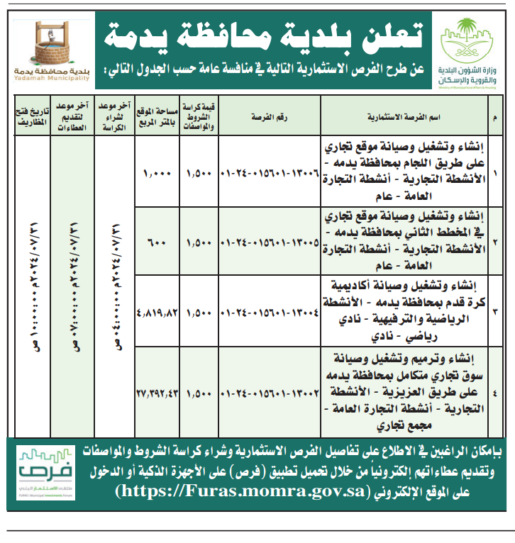 *طرح الفرص الاستثمارية التالية في منافسة عامة حسب الجدول التالي