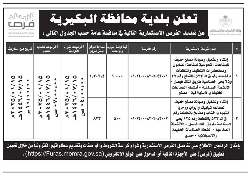 منافسة عامة- إنشاء وتشغيل وصيانة مصنع خفيف للصناعة التحويلية- بلدية محافظة البكيرية
