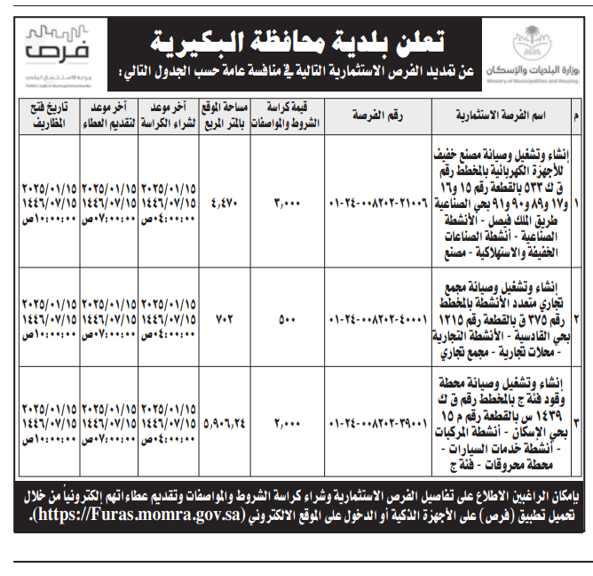 *تمديد الفرص الاستثمارية التالية في منافسة عامة حسب الجدول التالي