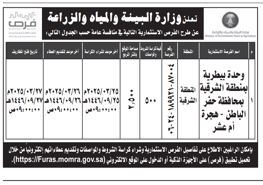 منافسة عامة- وحدة بيطرية بمنطقة الشرقية بمحافظة حفر الباطن- وزارة البيئة والمياه والزراعة