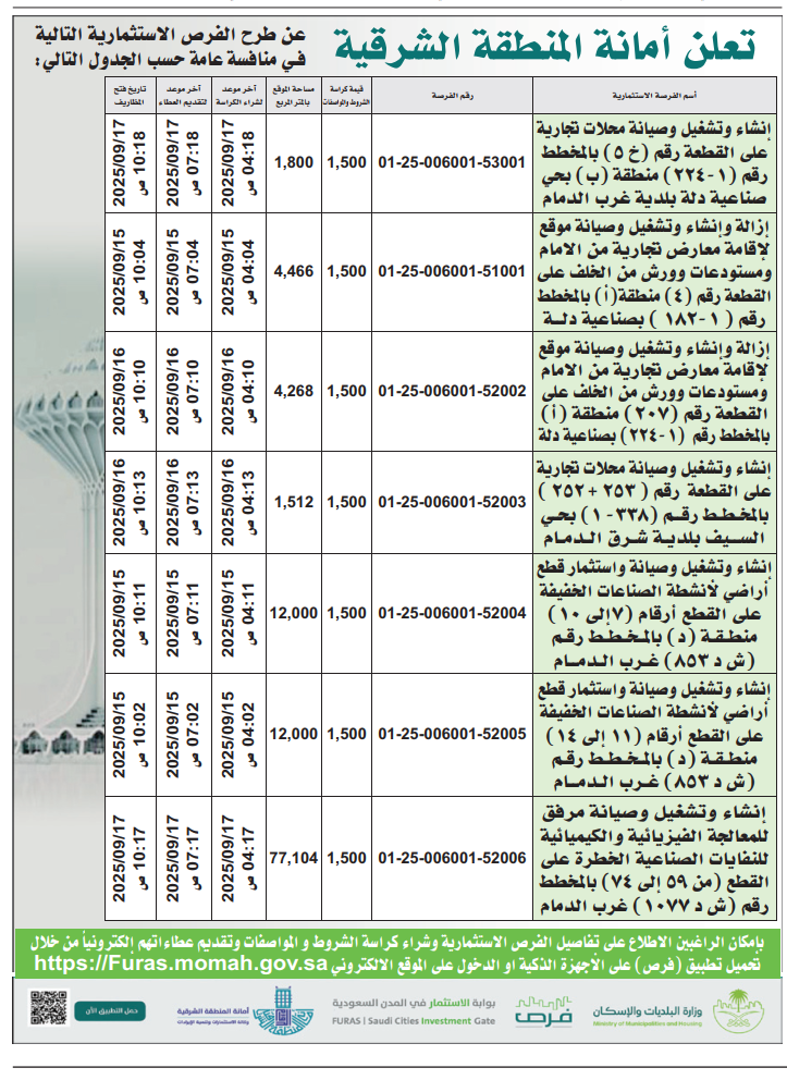 *طرح الفرص الاستثمارية التالية في منافسة عامة حسب الجدول التالي