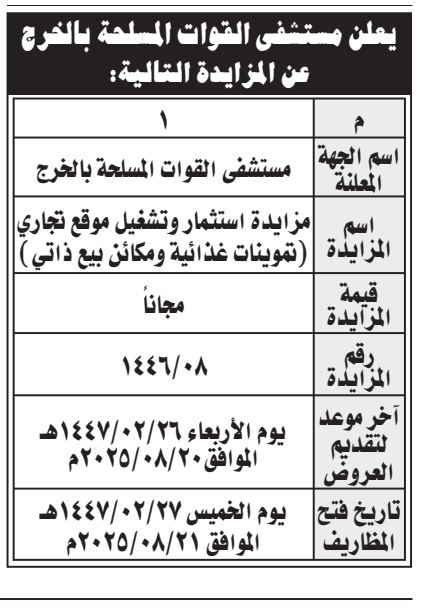 مزايدة- استثمار وتشغيل موقع تجاري تموينات غذائية- مستشفى القوات المسلحة بالخرج