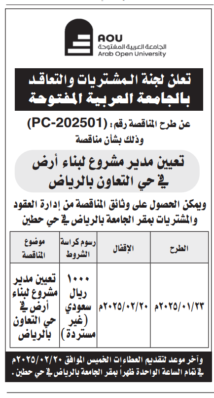 مناقصة- تعيين مدير مشروع لبناء أرض في حي التعاون بالرياض- الجامعة العربية المفتوحة