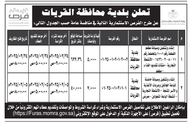 منافسة عامة- إنشاء وتشغيل وصيانة مطعم- بلدية محافظة القريات