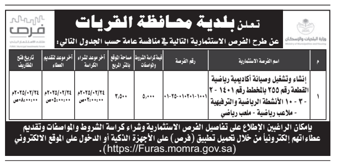 منافسة عامة- إنشاء وتشغيل وصيانة أكاديمية رياضية- بلدية محافظة القريات