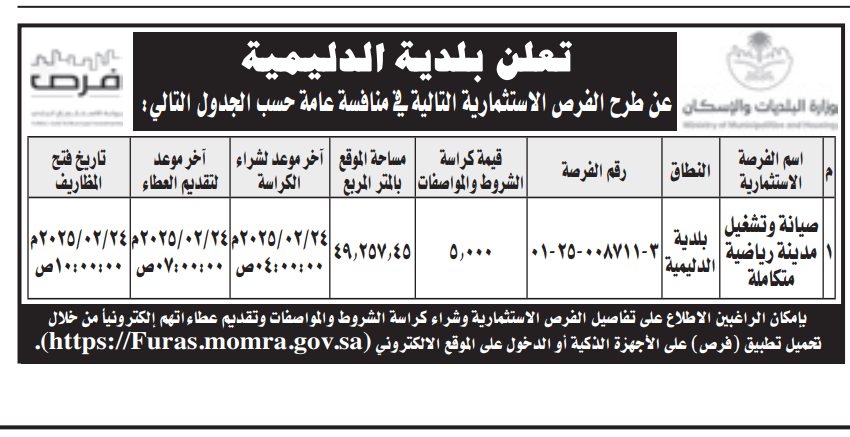 *طرح الفرص الاستثمارية التالية في منافسة عامة حسب الجدول التالي