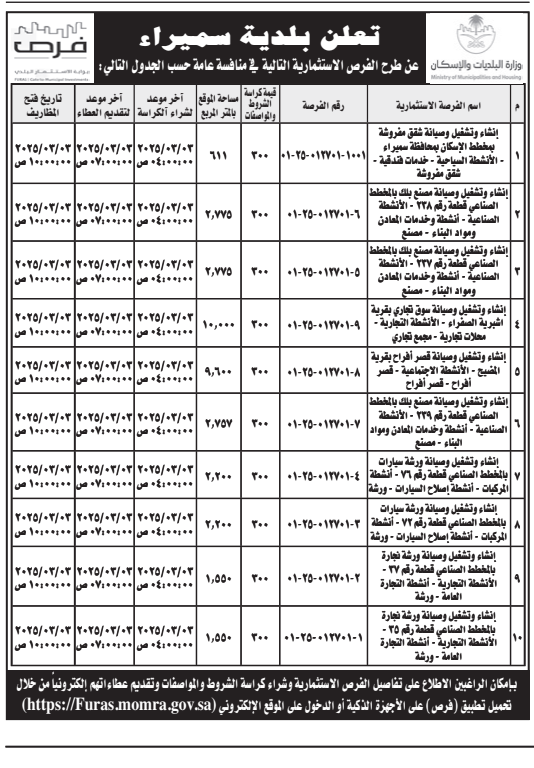 *طرح الفرص الاستثمارية التالية في منافسة عامة حسب الجدول التالي