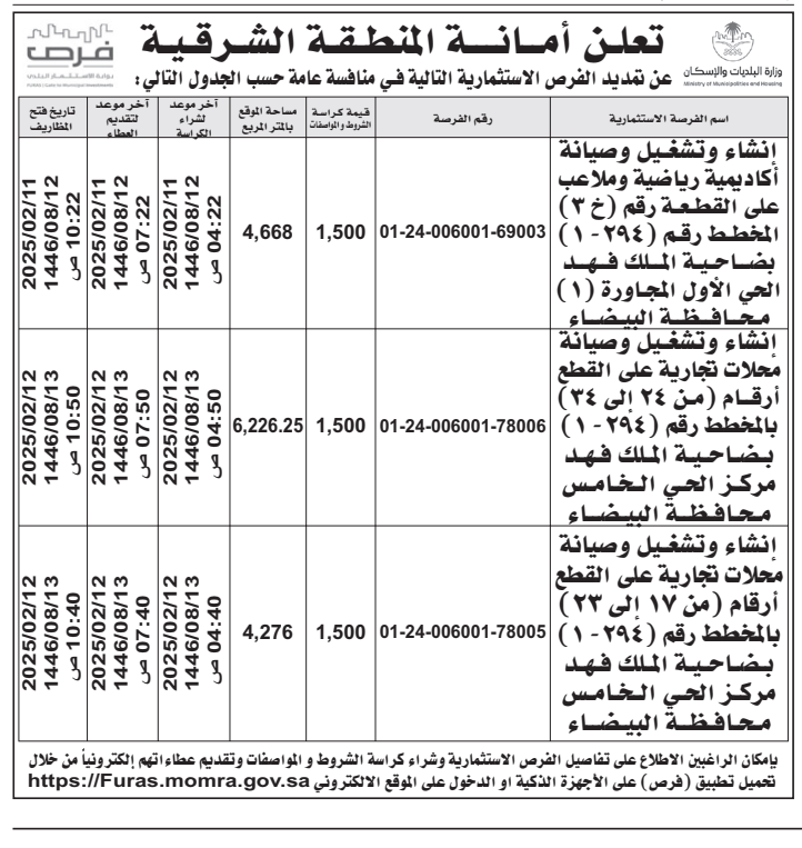*تمديد الفرص الاستثمارية التالية في منافسة عامة حسب الجدول التالي