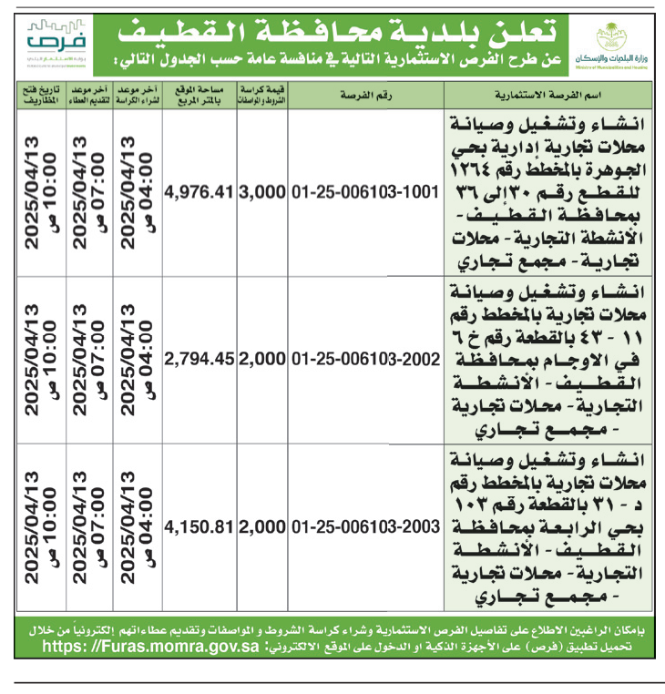 *طرح الفرص الاستثمارية التالية في منافسة عامة حسب الجدول التالي