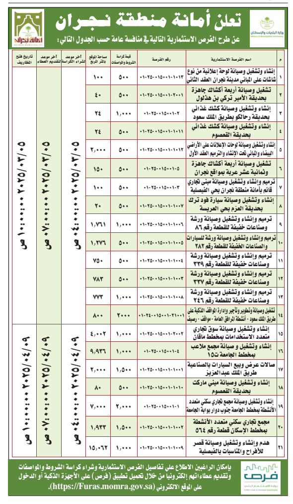 *طرح الفرص الاستثمارية التالية في منافسة عامة حسب الجدول التالي