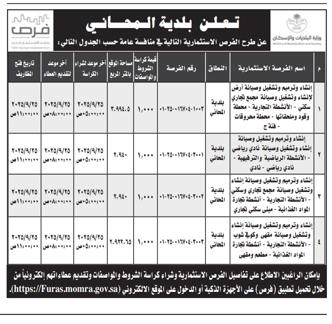 *طرح الفرص الاستثمارية التالية في منافسة عامة حسب الجدول التالي
