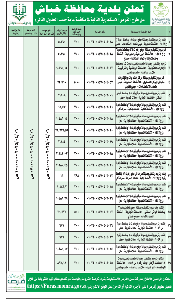 منافسة عامة- إنشاء وترميم وتشغيل موقع أنشطة تجارية- بلدية محافظة خباش