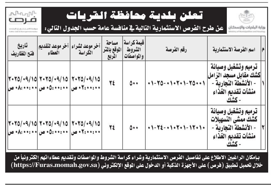 منافسة عامة- ترميم وتشغيل وصيانة كشك أنشطة تجارية- بلدية محافظة القريات