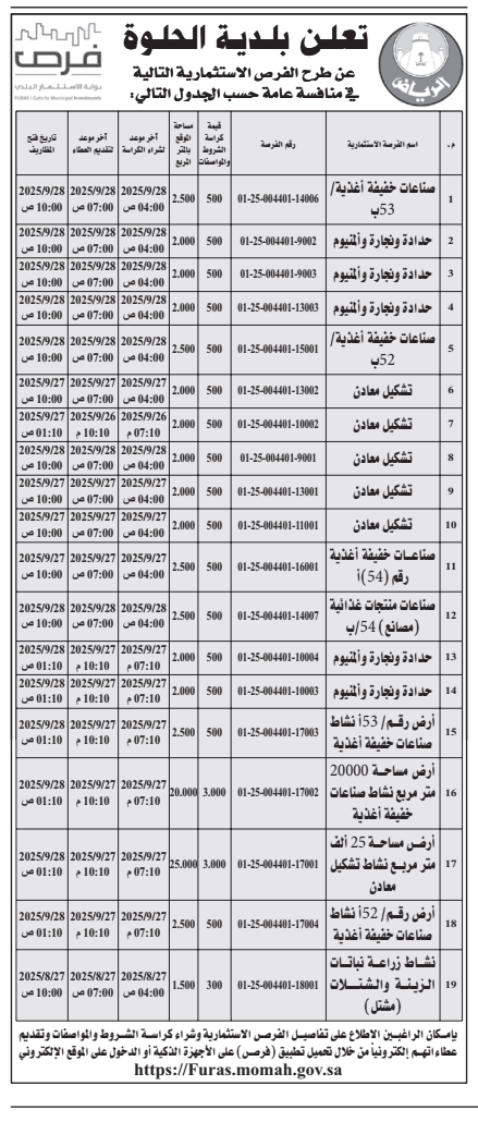 *طرح الفرص الاستثمارية التالية في منافسة عامة حسب الجدول التالي