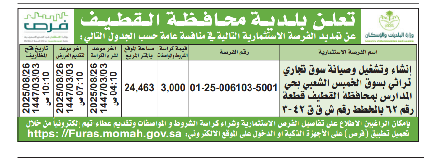 منافسة عامة- إنشاء وتشغيل وصيانة سوق تجاري- بلدية محافظة القطيف