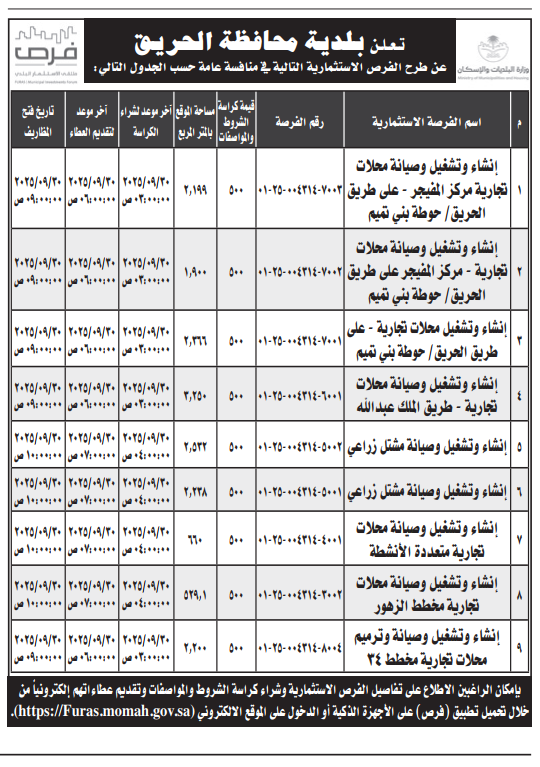 *طرح الفرص الاستثمارية التالية في منافسة عامة حسب الجدول التالي
