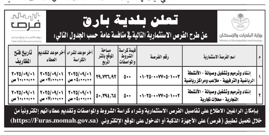 منافسة عامة- إنشاء وترميم وتشغيل وصيانة أنشطة رياضية ترفيهية- بلدية بارق