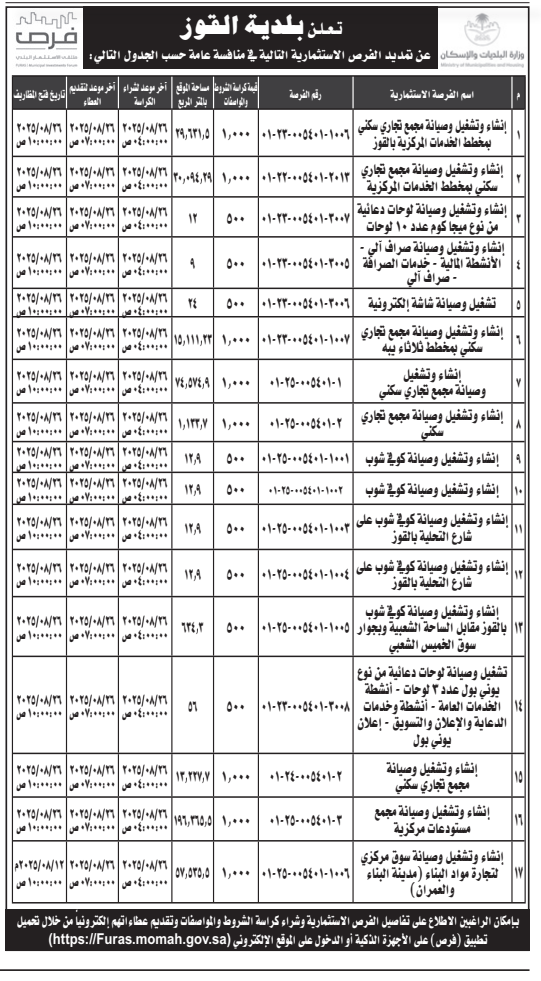 منافسة عامة- إنشاء وتشغيل وصيانة مجمع تجاري سكني- بلدية القوز