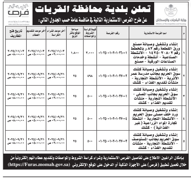 تعلن بلدية محافظة القريات عن