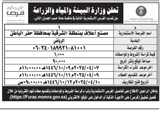 *تمديد الفرص الاستثمارية التالية في منافسة عامة حسب الجدول التالي