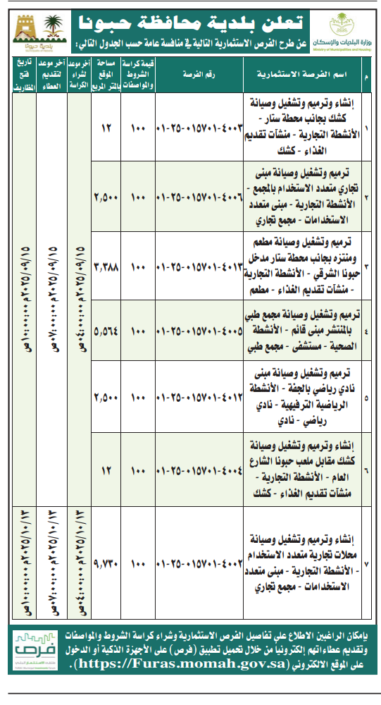 *طرح الفرص الاستثمارية التالية في منافسة عامة حسب الجدول التالي