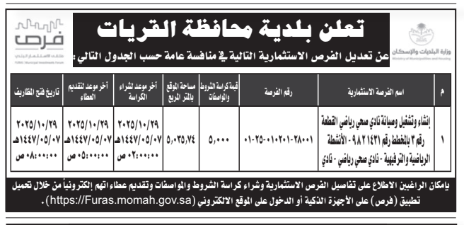 منافسة عامة- إنشاء وتشغيل وصيانة نادي صحي رياضي- بلدية محافظة القريات