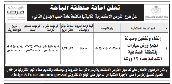 منافسة عامة- إنشاء وتشغيل وصيانة مجمع ورش سيارات- أمانة منطقة الباحة