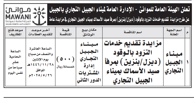 مزايدة- تقديم خدمات التزود بالوقود ديزل/ بنزين بمرفأ صيد الأسماك- الهيئة العامة للموانئ الإدارة العامة لميناء الجبيل التجاري