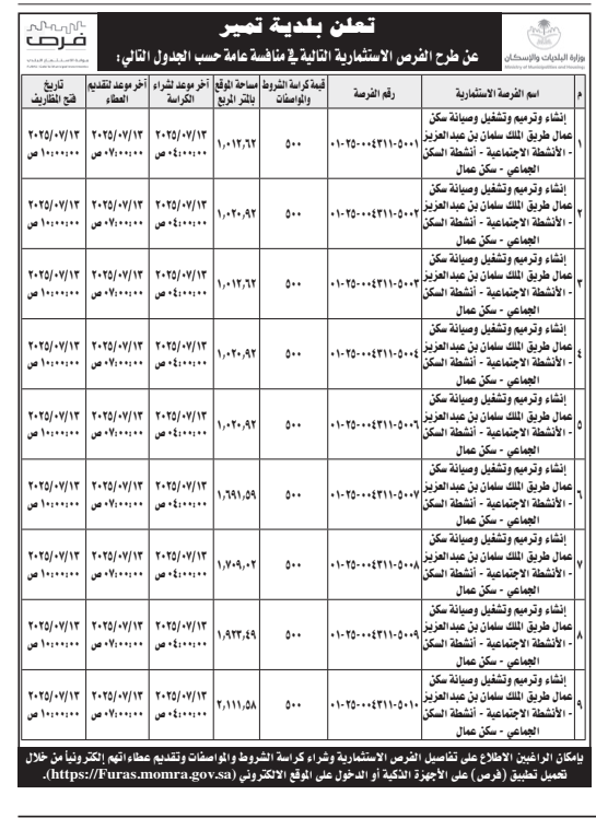 *طرح الفرص الاستثمارية التالية في منافسة عامة حسب الجدول التالي