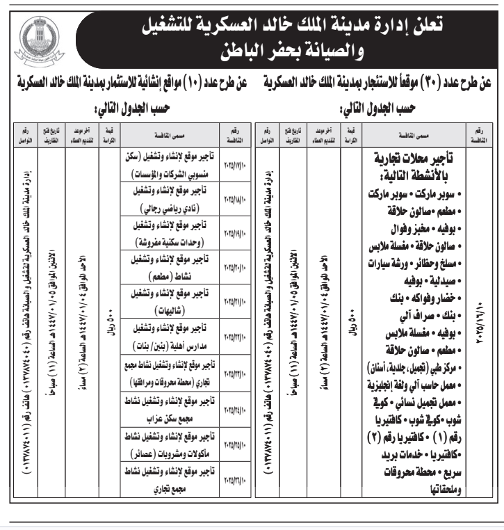 منافسة استثمارية- تأجير محلات تجارية- إدارة مدينة الملك خالد العسكرية للتشغيل والصيانة بحفر الباطن