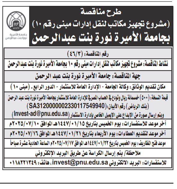 مناقصة- مشروع تجهيز مكاتب لنقل إدارات مبنى رقم 10 بالجامعة- جامعة الأميرة نورة بنت عبد الرحمن
