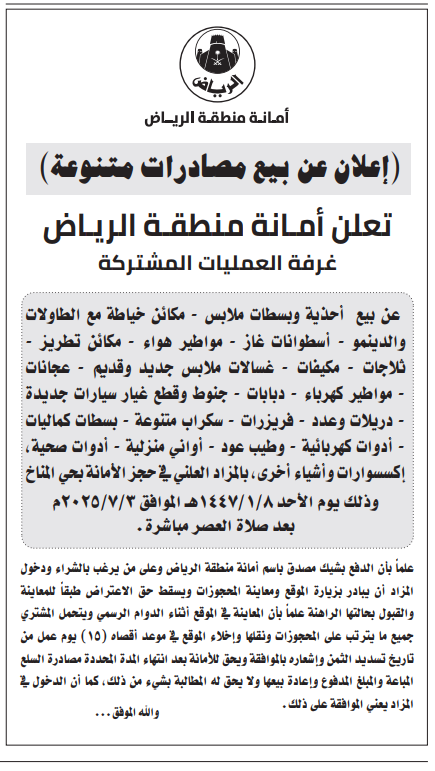 مزاد علني- بيع مصادرات متنوعة- أمانة منطقة الرياض