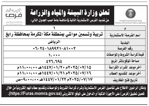 منافسة عامة- تربية وتسمين مواشي بمنطقة مكة المكرمة بمحافظة رابغ- وزارة البيئة والمياه والزراعة