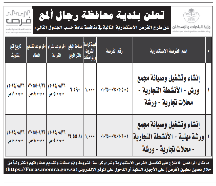 منافسة عامة- إنشاء وتشغيل وصيانة مجمع ورش- بلدية محافظة رجال ألمع