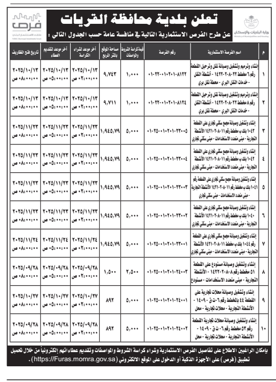 تعلن بلدية محافظة القريات عن