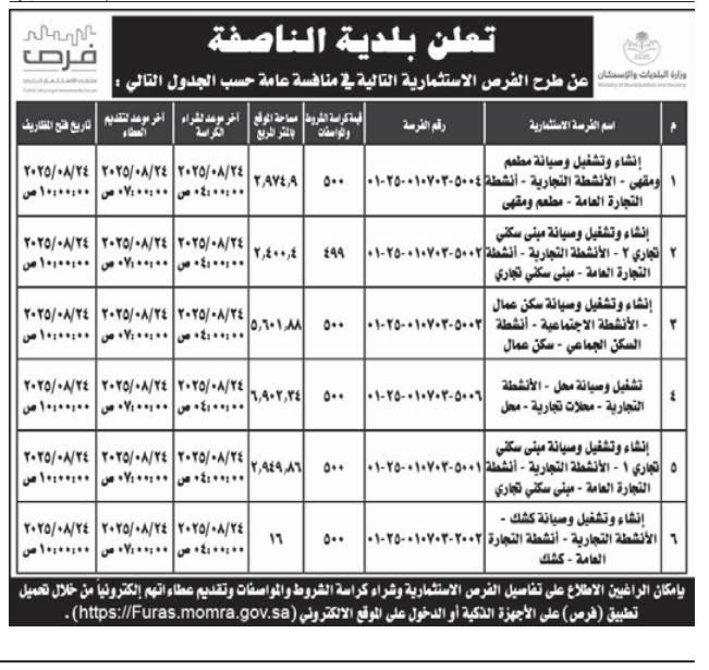 *طرح الفرص الاستثمارية التالية في منافسة عامة حسب الجدول التالي