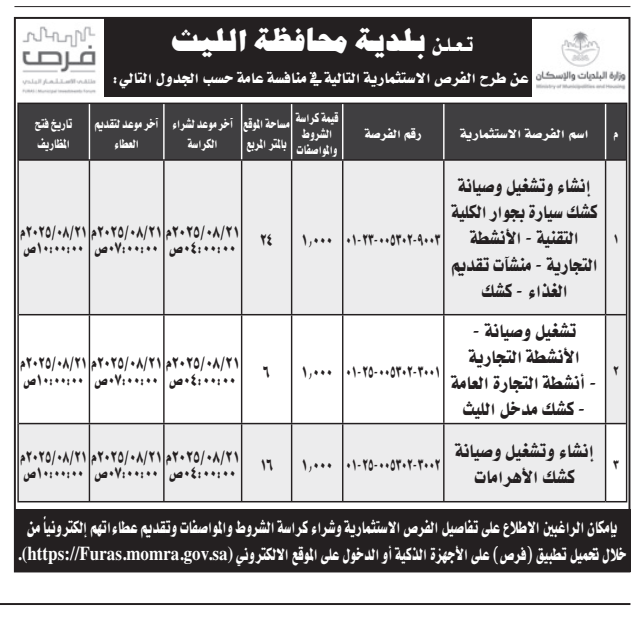 *طرح الفرص الاستثمارية التالية في منافسة عامة حسب الجدول التالي