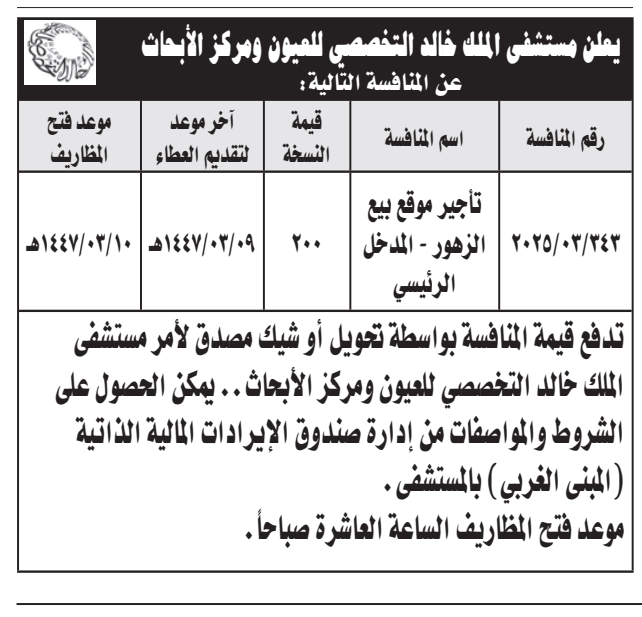 منافسة- تأجير موقع بيع الزهور المدخل الرئيسي- مستشفى الملك خالد التخصصي للعيون ومركز الأبحاث