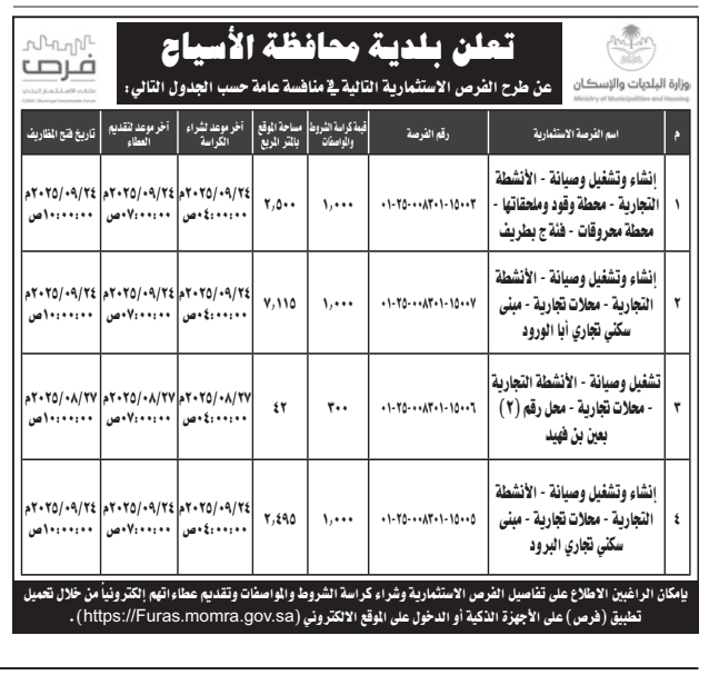 منافسة عامة- إنشاء وتشغيل وصيانة أنشطة تجارية- بلدية محافظة الأسياح