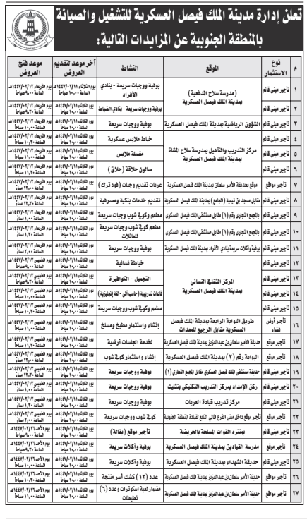 تعلن إدارة مدينة الملك فيصل العسكرية للتشغيل والصيانة بالمنطقة الجنوبية عن