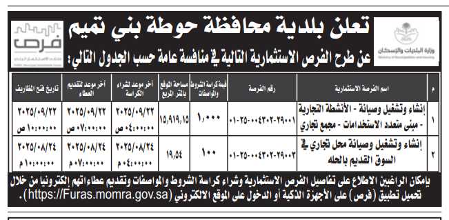 منافسة عامة- إنشاء وتشغيل وصيانة أنشطة تجارية- بلدية محافظة حوطة بني تميم