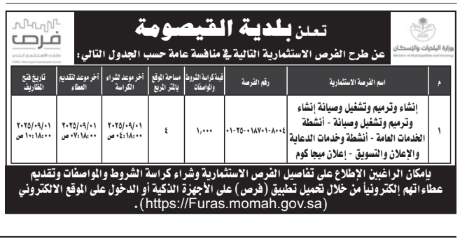 منافسة عامة- إنشاء وترميم وتشغيل وصيانة أنشطة الخدمات العامة- بلدية القيصومة