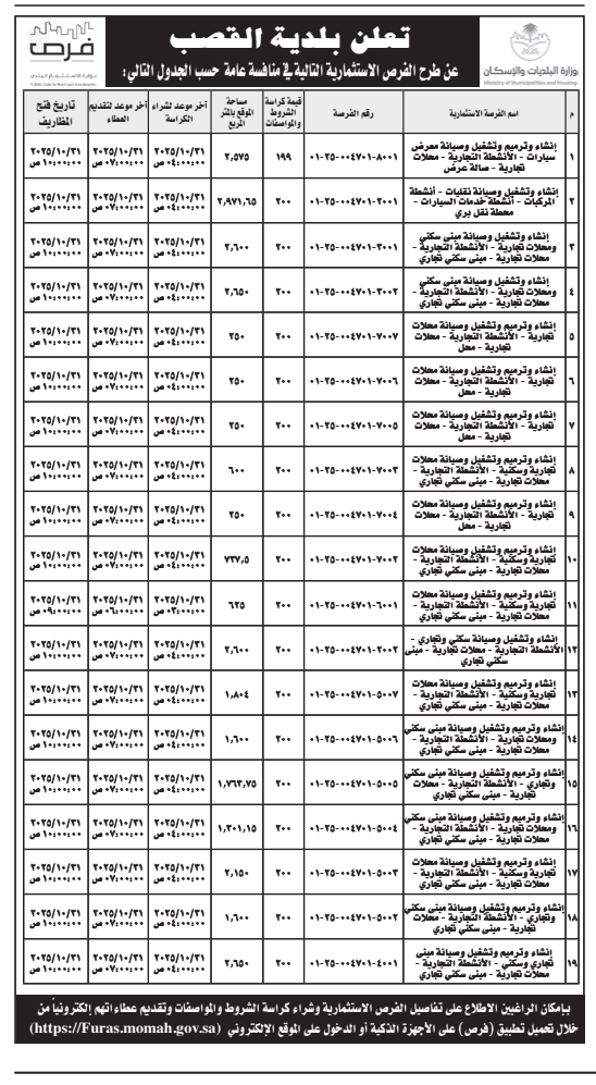 *طرح الفرص الاستثمارية التالية في منافسة عامة حسب الجدول التالي