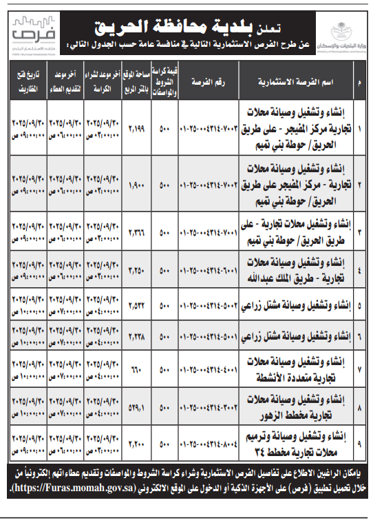 *طرح الفرص الاستثمارية التالية في منافسة عامة حسب الجدول التالي