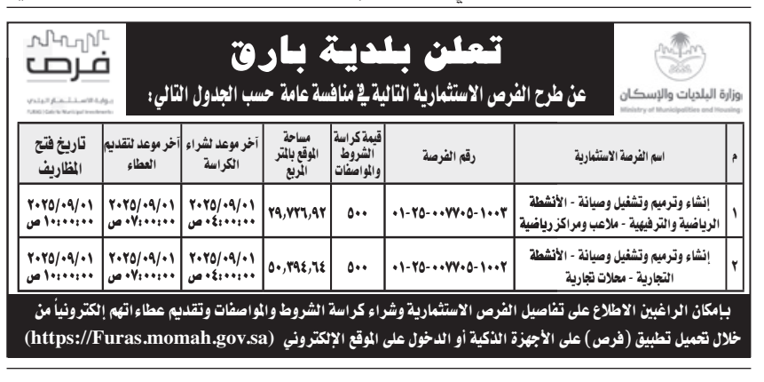 منافسة عامة- إنشاء وترميم وتشغيل وصيانة أنشطة رياضية وترفيهية- بلدية بارق