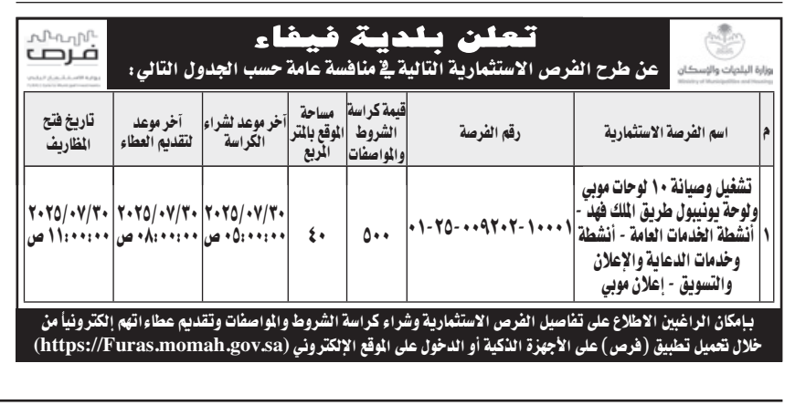 منافسة عامة- تشغيل وصيانة 10 لوحات موبي ولوحة يونيبول- بلدية فيفاء