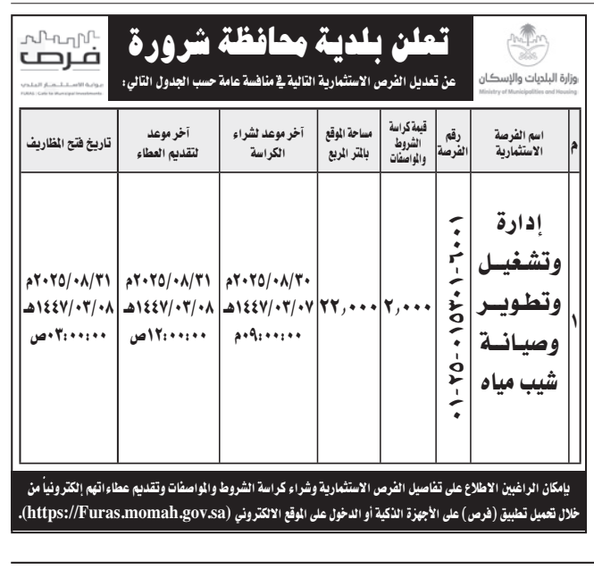 منافسة عامة- إدارة وتشغيل وتطوير وصيانة شيب مياه- بلدية محافظة شرورة