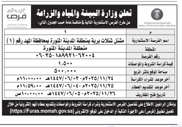 *طرح الفرص الاستثمارية التالية في منافسة عامة حسب الجدول التالي
