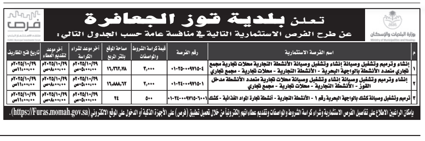 منافسة عامة- إنشاء وترميم وتشغيل الأنشطة التجارية- بلدية قوز الجعافرة